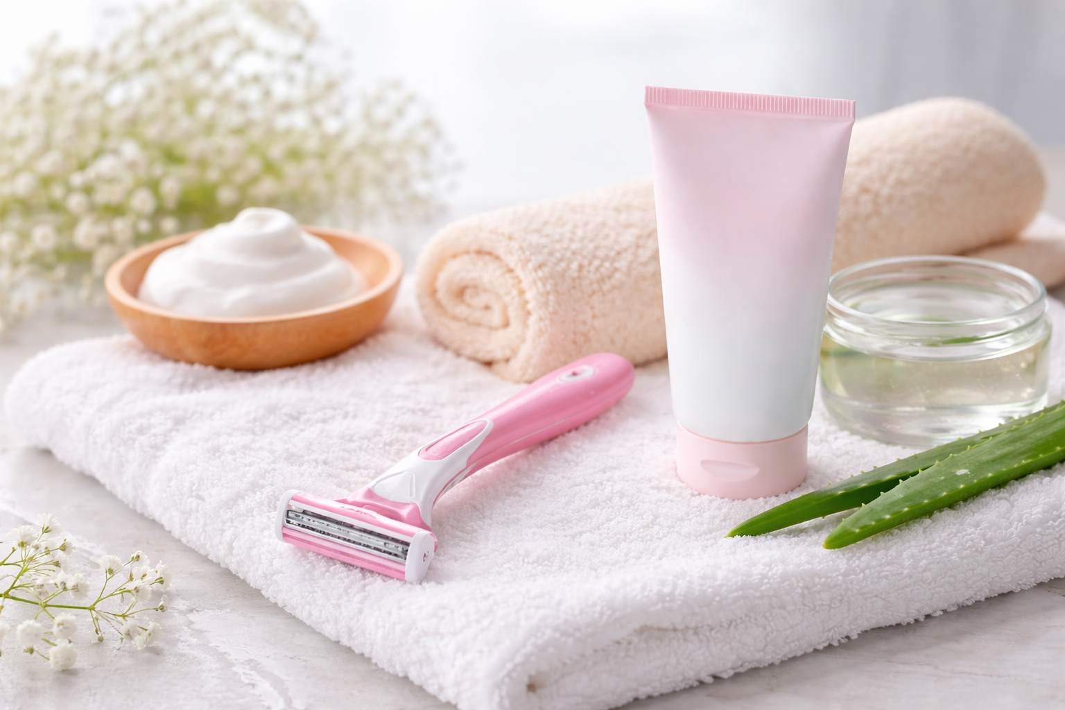 Sanfter Rasierer mit Pflegeprodukten auf einem Handtuch als Symbol für schonende Intimrasur